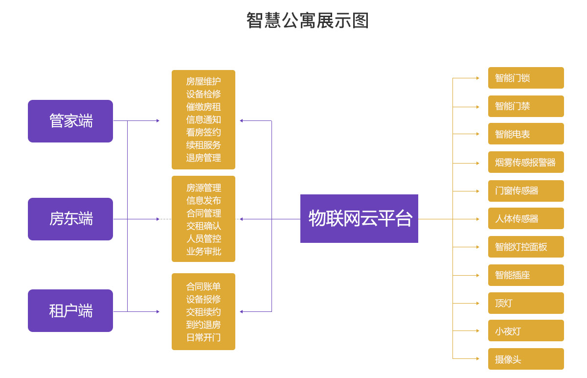 智慧公寓方案融合自動化控制系統(tǒng)、移動互聯(lián)網(wǎng)、物聯(lián)網(wǎng)和網(wǎng)絡(luò)通訊技術(shù)于一體,解決了傳統(tǒng)公寓存在的管理混亂、程序繁瑣、安全隱患等問題。包含用戶端、云平臺、智能終端三個層級。其中用戶端又分為管家端、租戶端、房東端,三方根據(jù)平臺分配的不同權(quán)限,運營統(tǒng)一后臺管理入口,集房源管理上線、營銷、租戶管理、費用收取、物業(yè)管理、客服管理等管理功能于一體,共同維護公寓的健康運營,實現(xiàn)公寓的智能化管理。